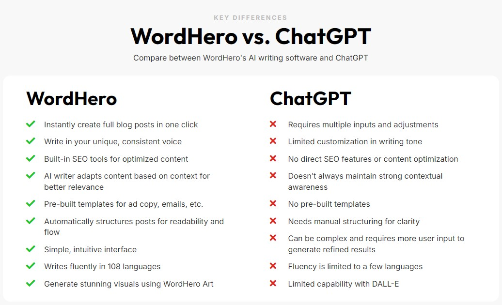Choosing WordHero involves evaluating if its features align with your content needs. Here’s a comparison table to help: