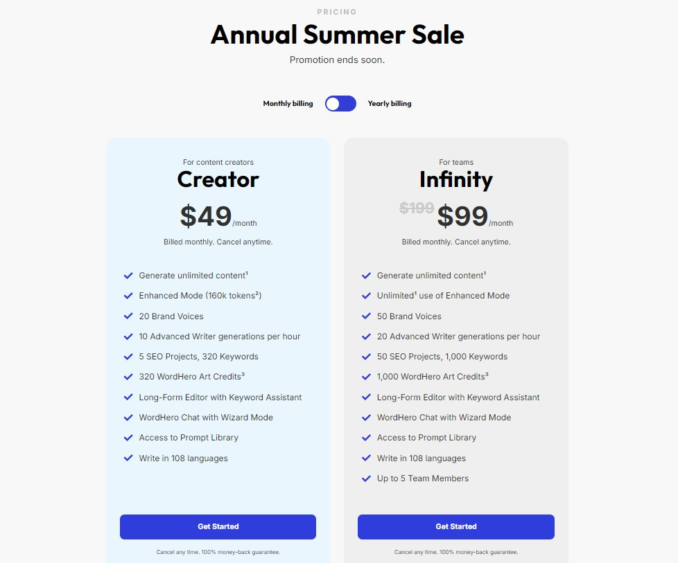 WordHero offers a unique pricing model with its Life Time Deal. Users can enjoy perpetual access without monthly fees. The deal provides a cost-effective solution for creating AI-driven content.